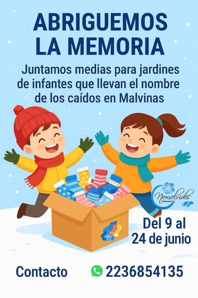 Desde el 9 hasta el 24 de junio, la Fundación No Me Olvides despliega una iniciativa que combina la solidaridad con la memoria histórica: “Abriguemos la Memoria”. La campaña tiene el noble objetivo de recolectar medias para niñas y niños, un gesto sencillo pero trascendental que busca brindar abrigo y cubrir las necesidades básicas de los más pequeños, enfrentando así el frío invernal. Además, esta acción busca honrar la memoria de los caídos en la Gesta de Malvinas, inculcando valores de conciencia y solidaridad desde la infancia.
