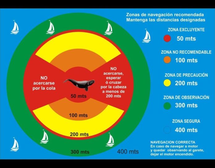 La imagen que circula sobre las zonas de navegación recomienda mantener distancias mínimas para proteger tanto a las ballenas como a los navegantes. Se establece una Zona Excluyente (rojo) de 50 metros alrededor de las ballenas, donde está totalmente prohibido navegar. La Zona No Recomendable (naranja) abarca de 50 a 100 metros, donde se aconseja evitar la navegación. A 200 metros, en la Zona de Precaución (amarillo), se debe navegar con extrema cautela, evitando acercamientos por la cabeza del animal. Finalmente, las zonas seguras para la observación se marcan con colores verde (a partir de 300 metros) y azul (más allá de 400 metros), donde se recomienda mantener una distancia respetuosa.