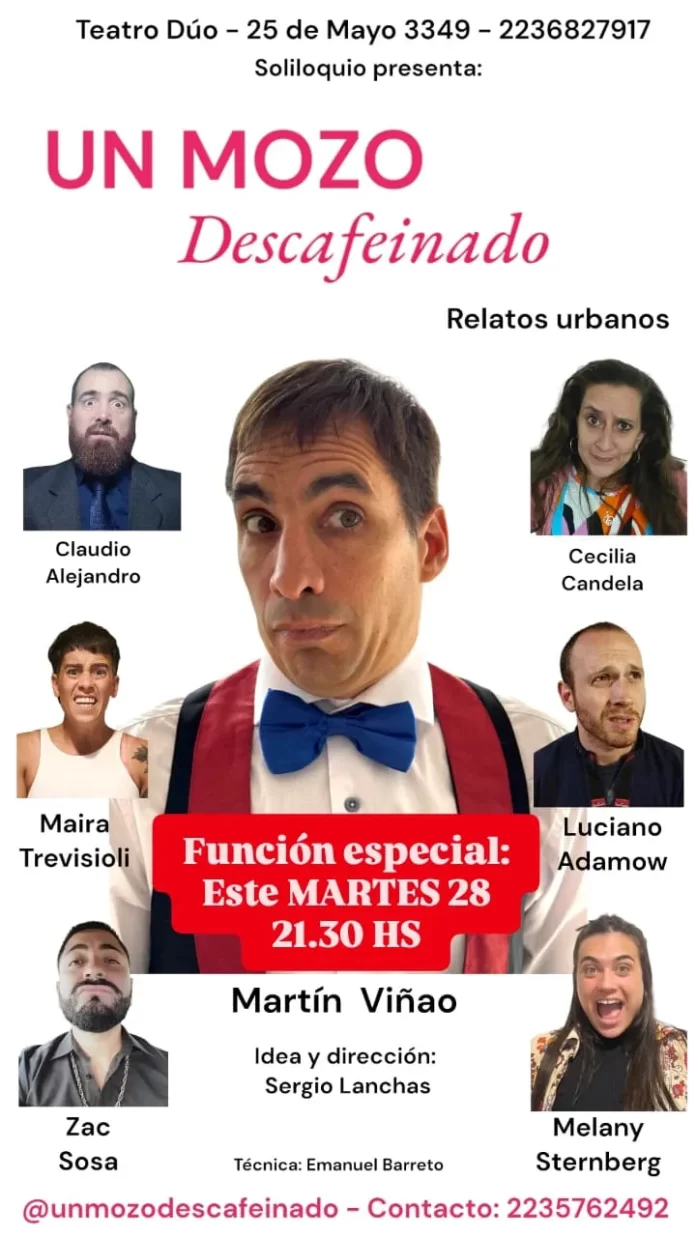 «Un mozo descafeinado» es una comedia que transcurre en un bar y gira en torno a un mozo con un carácter muy particular, capaz de exasperar a cualquier cliente. Con un elenco marplatense conformado por Cecilia Candela, Claudio Alejandro, Luciano Adamow, Maira Trevisioli, Melany Sternberg y Zac Sosa, la obra se ha convertido en un fenómeno de la temporada bajo la dirección de Sergio Lanchas.