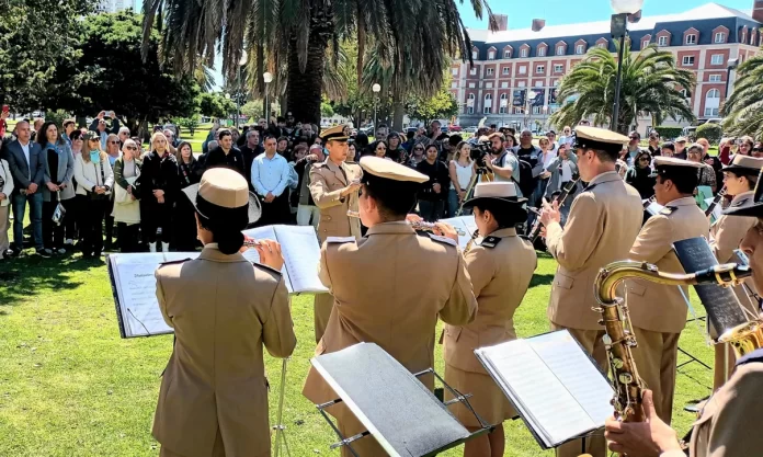 Posteriormente, en la Plaza Colón, se colocó una ofrenda floral en el monumento a la reina Isabel “La Católica», actividad que también contó con la participación de la Banda de Música de la PNA, que interpretó los himnos de Argentina y España, atrayendo con sus melodías a los transeúntes que circulaban por la zona.