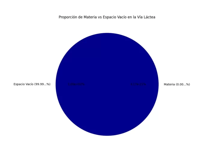 La densidad de la materia en la Vía Láctea es extremadamente baja. Para entender esto, consideremos el siguiente dato: en un año luz cúbico, que es un volumen de espacio de aproximadamente 9.461 billones de kilómetros cúbicos, cabe el volumen cúbico total de todas las estrellas de la Vía Láctea. No solo una vez, sino que en un solo año luz cúbico caben todas las estrellas de 3.000 millones de Vías Lácteas. Esto significa que la materia en la Vía Láctea existe a una razón de 1 parte por cada 24 sextillones de espacio vacío, o 1 parte por cada 24.000.000.000.000.000.000.000. Esta densidad es tan baja que, en términos de volumen, la materia es prácticamente inexistente en comparación con el vacío.