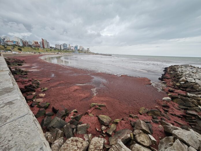 Al caminar por la orilla, los visitantes se encontraron con una capa de varios metros de ancho compuesta por macroalgas rojas y verdes. Estas formaban un tapiz flotante en la superficie del agua y, al retirarse la marea, dejaban sedimentos en la arena que alcanzaban volúmenes llamativos, incluso superando los 30 centímetros de altura en algunos sectores.