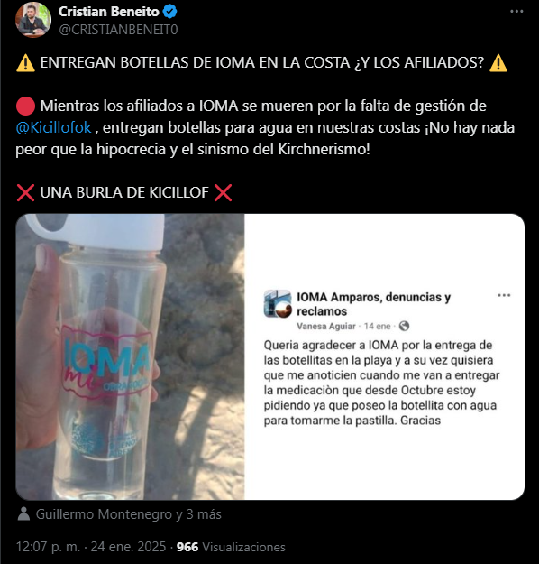 «Mientras los afiliados a IOMA se mueren por la falta de gestión de Kicillof, entregan botellas para agua en nuestras costas. ¡No hay nada peor que la hipocresía y el cinismo del Kirchnerismo!», escribió Beneito, sumando un nuevo capítulo a su serie de denuncias sobre la crisis en la obra social provincial.