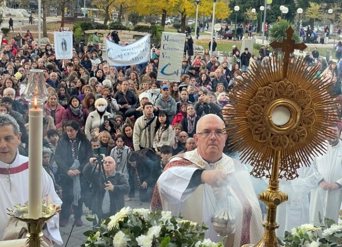 Fieles católicos de las distintas parroquias y capillas de Mar del Plata se congregaron la tarde del sábado en la Iglesia Catedral, donde participaron de la celebración del Corpus Christi. La misma comenzó con la Misa que presidió el administrador apostólico de la diócesis, monseñor Ernesto Giobando, y continuó con la procesión por las calles del centro, en la que la Eucaristía fue llevada en la custodia como signo público de fe y devoción en la presencia real de Jesús en ese sacramento.